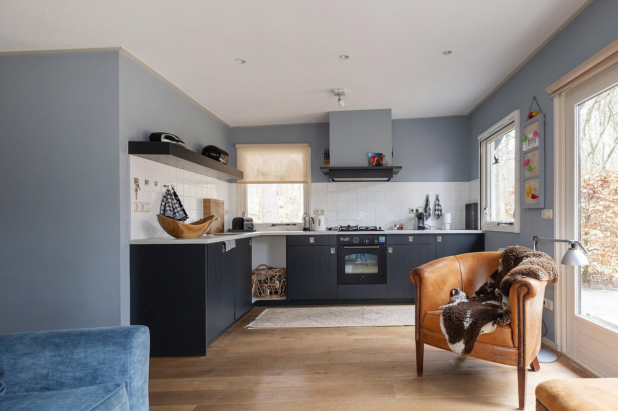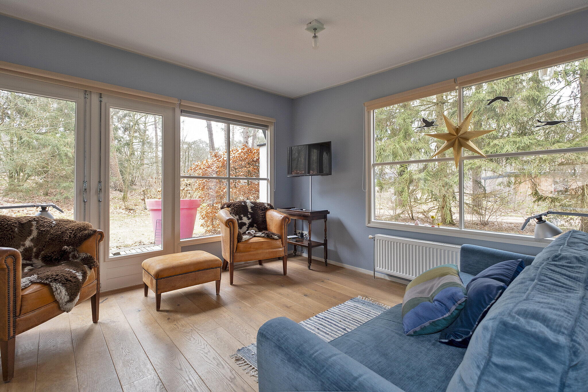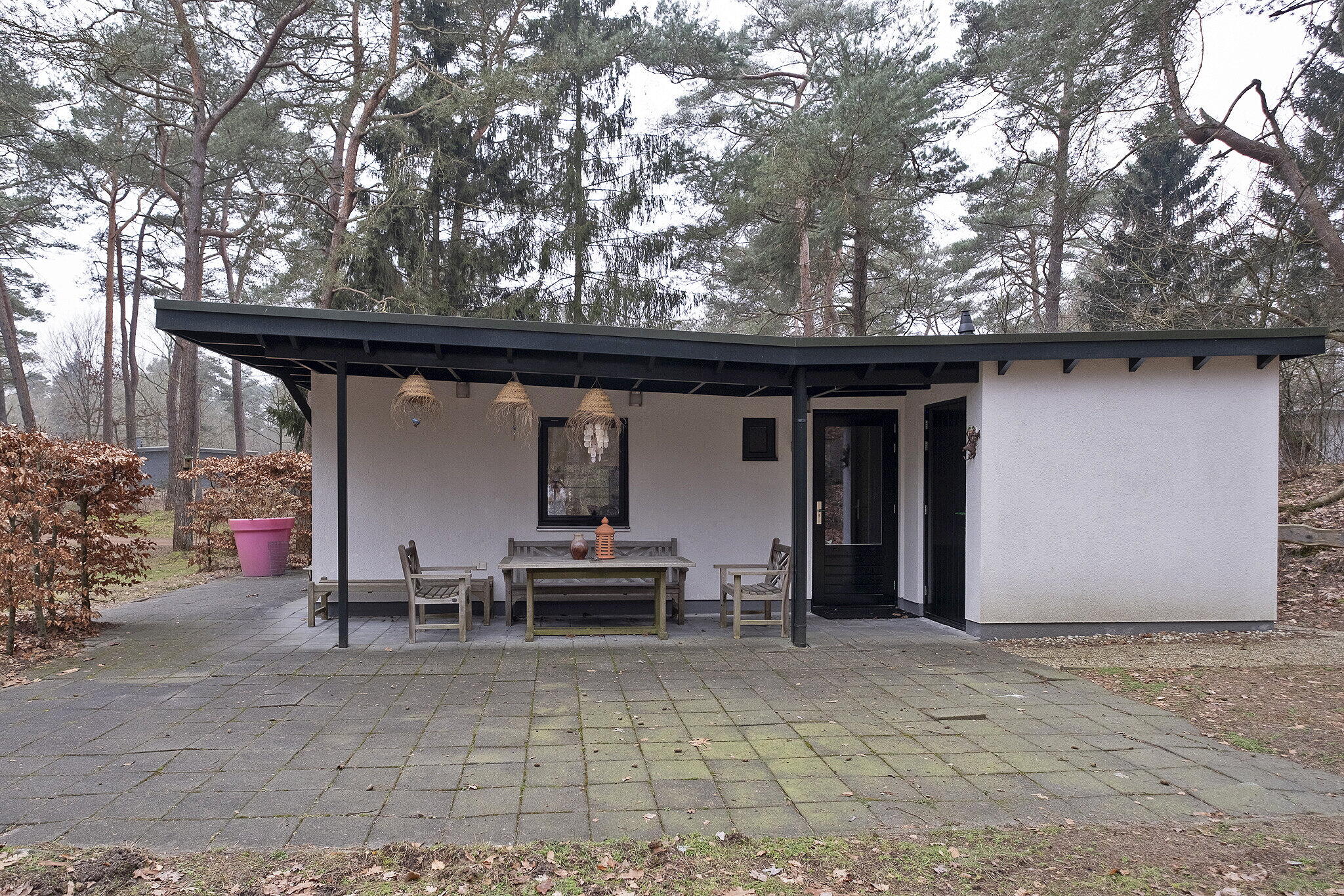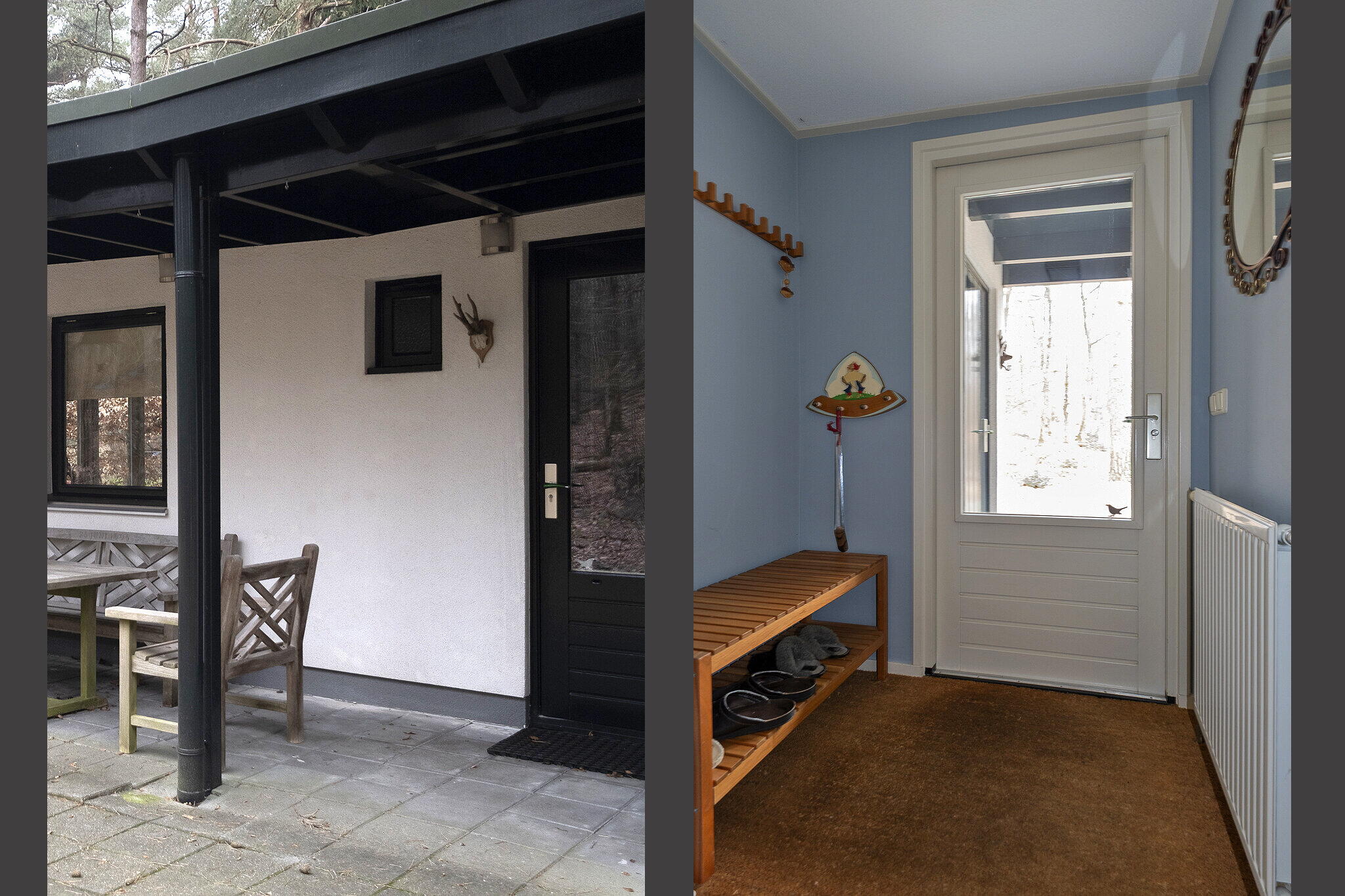 Entree in hal, lichte woonkamer met open keuken (ca. 28m²) met een prachtig uitzicht op het bos rondom. Via de openslaande deuren aan de voorzijde heeft u direct toegang tot het zonnige zitterras. De open keuken is modern, heeft een koelkast, 4-pits gaskookplaat, vaatwasser, oven en volop bergruimte. Op de vloer licht een stijlvolle houten vloer die doorloopt in de twee slaapkamers (ca. 12m² en ca.7m²). De nette badkamer is voorzien van een toilet, douchecabine en wastafelmeubel. Aan de zijkant is een overdekte veranda geplaatst waar het heerlijk vertoeven is. Direct naast de woning bevindt zich parkeerruimte voor twee voertuigen.